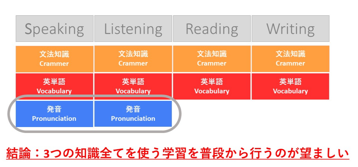 リーディングとライティングの運用には「発音」の知識・練習が必要とされないため、この2つを集中的に行っていても、「発音」の知識が必要なスピーキングとリスニングへの波及効果は薄いです。