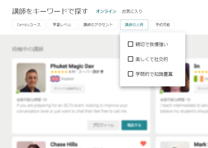 また、「趣味」「使用言語(日本語対応の可否)」「人柄」などで講師を絞り込めるフィルター機能を備えたサービスも多く、理想の先生に出会いやすい環境が整っています。