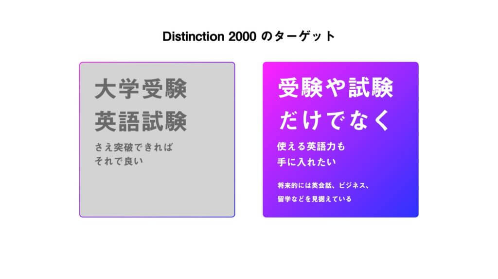 Distinction 2000が他の英単語帳と何が違うかを具体的に説明するために、まずDistinction 2000のターゲット層と、そこから生まれたコンセプトを解説いたします。