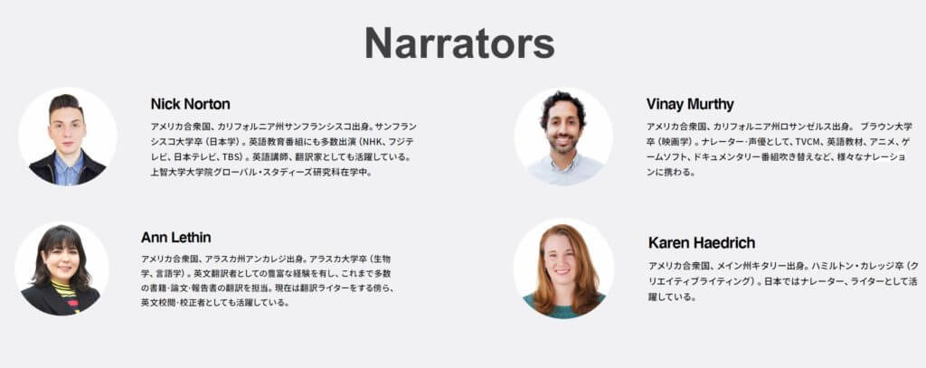 プロのナレーターとして綺麗に読むのではなく、できる限り自然に、普段通りの発音を心掛けていただいたため、音声を聞くとその違いを感じていただけるかと思います!