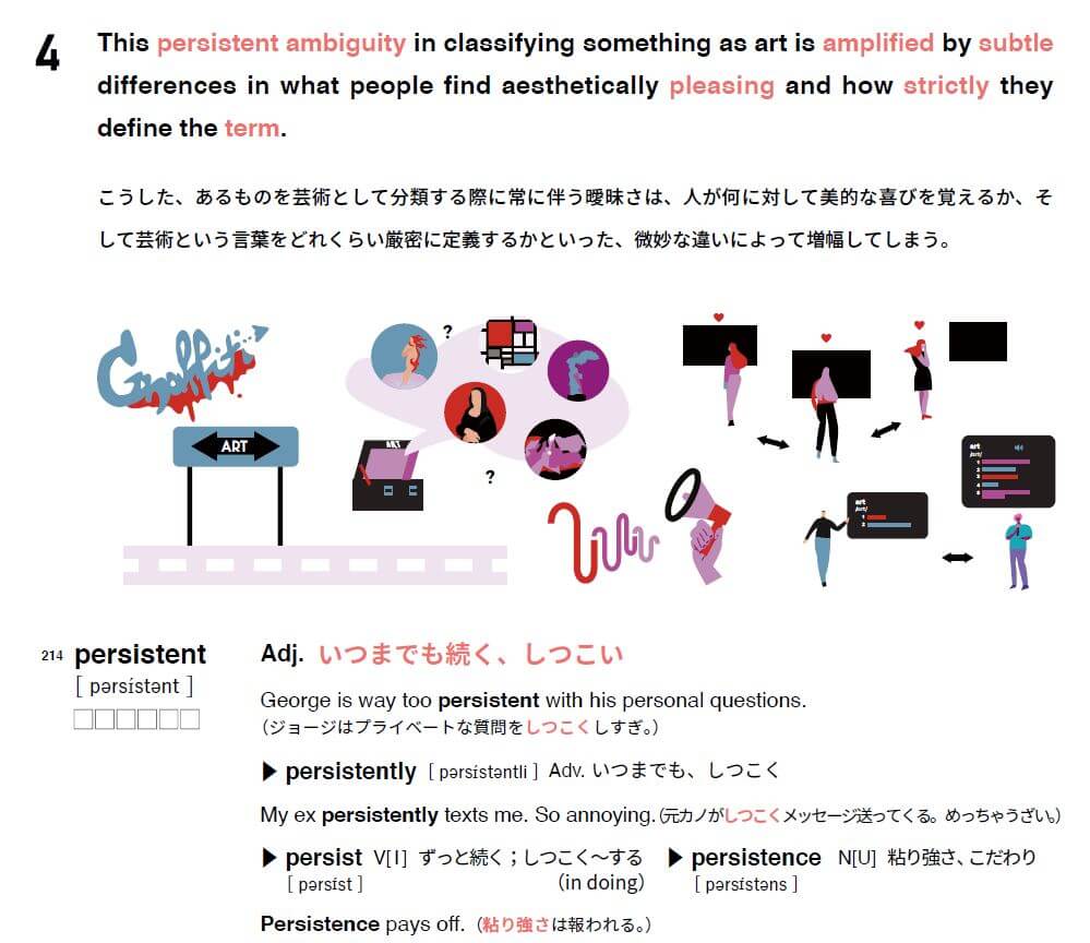 このイラストは、「日本語を介在させない英文のアウトプット」を単語帳学習の中で行えるようにすることを目的に掲載したもので、上級者向けのツールだと言うことができると思います。