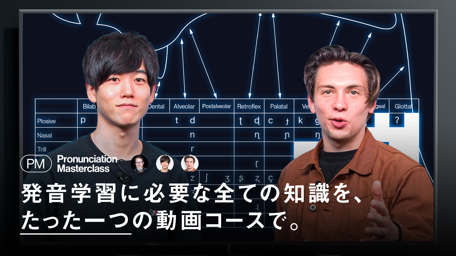 動画内では、私が音声学の理論を解説し、その理論をカリフォルニア出身のネイティブニックがデモンストレーションします。発音の専門的な知識を、日本人学習者の視点から体系的に、分かりやすく解説し、その知識をネイティブが実践的に、楽しく、モチベーショナルに展開した発音マスタークラス。
