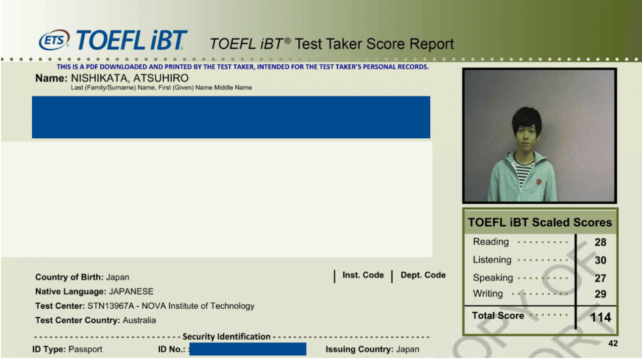 この記事は、私がTOEFL iBTで114点を取得した際の体験レポです。