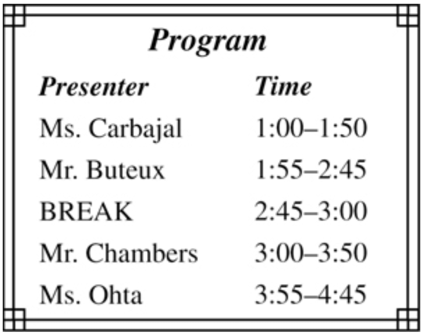 No. 82 Look at the graphic. Who will be the final presenter?