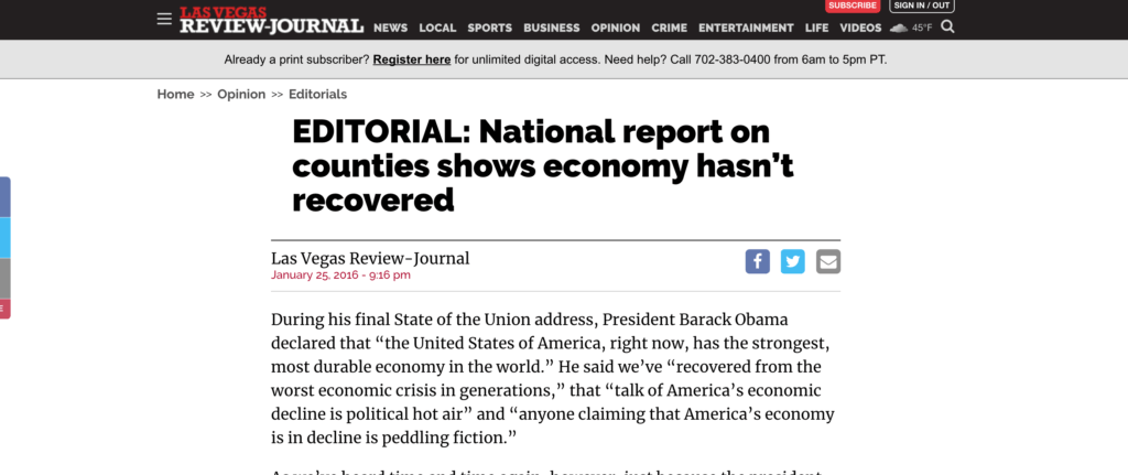 今回は、Review Journalの「National report on counties shows economy hasn’t recovered」という記事を使って勉強している想定で進めます。