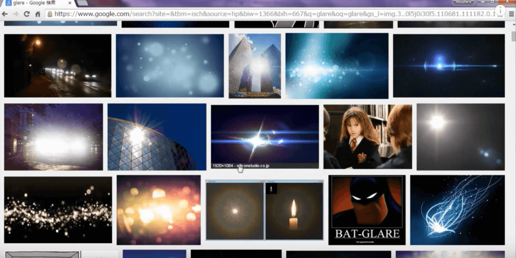 「glare」とグーグル画像検索で調べると、「glare」に関連する画像が大量に表示されます。