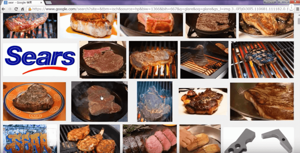 「sear」で検索すると、美味しそうに焼き目がついたステーキの画像が多く表示されます。