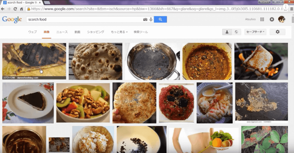 一方で、「scorch food」と検索すると、かなり焦げた、黒くなった食べ物の画像が目立ちます。