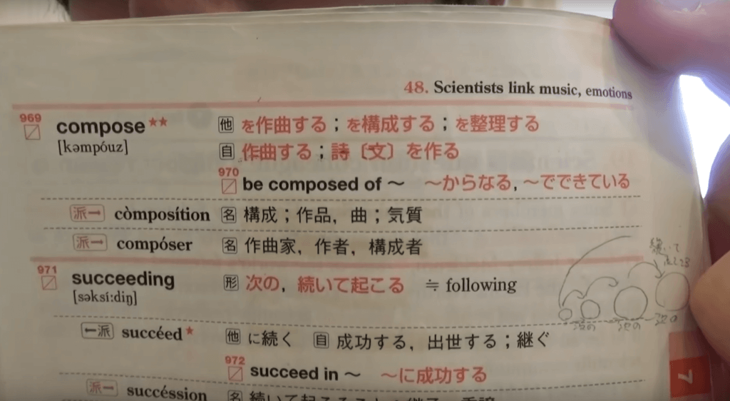 例えば、私が大学受験の時に使用した「Core1900」の971番目には「succeeding」という単語が掲載されています。意味は以下の通りです。